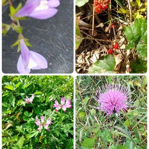 こんにちは😁今日、畑の奥の溜め池に行って来ました。山の中腹にあるので、山野草があるのではと期待して行きました。池に行く前に、田んぼの側で、アザミとレンゲを見つけました。狂い咲きでしようが、可愛いかったのでー🌸左上、ムラサキサギゴケ 右上、冬イチゴ🍓