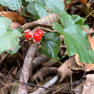 フユイチゴ(冬苺)見つけました🍓 晩秋から冬に実をつける可愛いらしい野イチゴ。 別名 カンイチゴ(寒苺) キラキラとしたルビーみたいな赤い実をのぞかせています。 数すくない冬に収穫できる木苺。 食べても美味しいそうですよ。