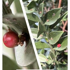 小さな厚めの葉の先にトゲ かわいらしい赤い実 これはなんと言う植物か、ご存知の方教えてください~🙇 『ナギイカダ』だそうです。 葉の裏に(正確には葉に見えるのは葉状茎という茎だそうですが)赤い実がくっついてるように見えますが、本当にくっついてるんですって‼️ 不思議な植物です😅💦