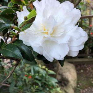 白いさざんか、数少ない蕾ですが、 花開くと八重咲きがとても美しいです。 歌にもあるように山茶花は冬の代表的なお花ですね🌿