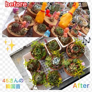 こんばんは(*^▽^*)ノ💐💓 上⬆️…先日投稿しました、45さんの韓国苗…全財産(笑)ꉂ🤣𐤔 … 45さんからアドバイスで… 苗に対して鉢が大きいみたいで💦 苗に合わせた鉢…又は寄せ植えにしたら良いって言う事を考えて頂きました🙇♀️💐 … で…早速…セダム🌿や、赤ちゃん👶等…あれやこれや😆🎶ぶっ刺してみました😅💦 賑やかにはなったけど🥳🎶 主役の韓国苗が目立たなくなった😭💦 これで良いのかな🙄💦 アドバイスよろしくお願い致します🙇♀️ … 今夜も10時からバイト😅😂🤣 近くにキャンプ場⛺️があって… お陰様で商売繁盛(笑)ꉂ🤣𐤔 品出し必死のBBA今夜も頑張ります💪🔥💦💦💦