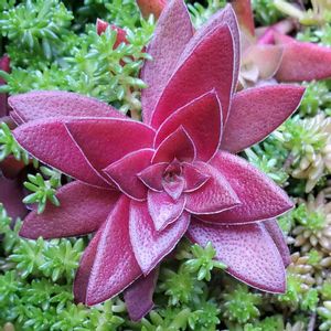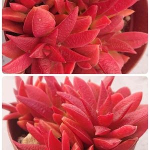 紅く紅葉🍁したクラッスラ その1 元から、赤いのを買ったんですよ😁 🍂紅葉祭り(もみじまつり)クラッスラ属🍁 十字の葉の形、クラッスラ だね。 濃い赤で、クローズアップの表面は艶のある皮のように見える。