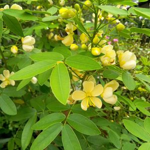 散歩の途中🚶♂️ 他所様のそとの花壇 高さ1メートルくらい。 花の名前教えてください。 ハッピーさんに教えていただきました。 💛アンデスノオトメ(カッシア)💛でした。 マメ科 センナ属 和名: ハナセンナ 花言葉: 乙女の祈り