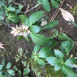 フッキソウ(富貴草) 果実 *ツゲ科フッキソウ属 花期は3〜4月 果期は10〜11月 北海道〜九州の山地の林内で見られる常緑小低木! グランドカバーとして植栽も多い! 雌雄同株で上部に雄花が密に付き その下に雌花が数個付く。 白い果実は中々結実しないようですが今回は数株が実を付けていました♪ 2本の花柱の名残りが可愛い姿になっています♪ ①②白い果実は森の真珠のよう❗️ ③来春の蕾もたくさんあります❗️ ④開花した花の様子❗️ (雄性期で雄花が開花!) 11月28日撮影