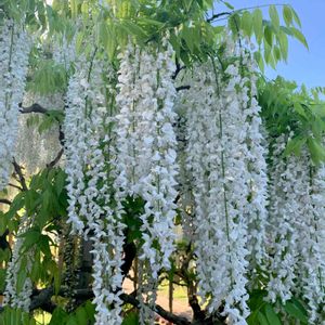 白い藤 狂い咲きでしょうか⁉️ 親戚の庭で咲いていました。