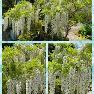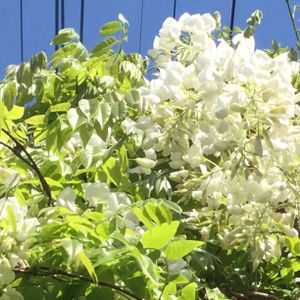 公園の入口のお宅の白藤、満開です‼️ 鉢植えなんですが、お見事❣️💚 晴れた空に映えて、輝いています❣️ やはり根が鉢底から出て、お庭に定着していました❣️💕
