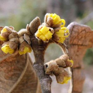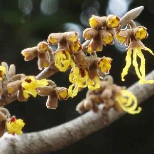 マンサクの花✨ ① ほころび始める2月 リボンのような花びらがきちんと折り畳まれています。