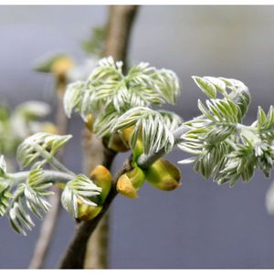 『イヌエンジュの新葉とリンゴの花、そしてハナミズキ』📷射水市櫛田神社⛩️にて☺(4月19日) ①イヌエンジュの新芽が美しい銀白色の葉🌿を展開中(*'▽'*)♪ ②は赤いリンゴ🍎の花、そして ③は咲き始めた花水木( ˘͈ ᵕ ˘͈ )🍊