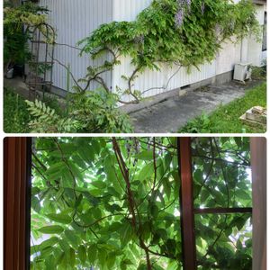 今年の藤はもじゃもじゃ〜 花が葉っぱに隠れてしまいました 花が済んだら、枝の誘引など頑張ってみようっと 下の写真は私の部屋から見た藤 窓は半分しか開かなくなってしまいました💦