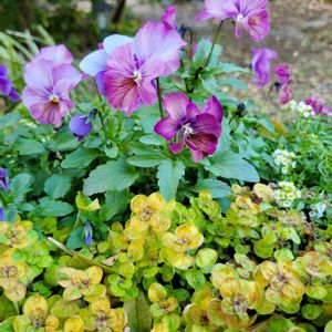 寄せ植え 左上の濃いピンクのカリブアコアと、右上のオレガノケント・ビューティーは生き残りそうなので、残りの場所にサーモンピンクのネメシア、イエロー系のビオラ。サーモンピンクのアリッサム、ヒューケラ トパーズジャズとシャンパン。隙間あいているようで、キツキツでしょう😊 黄色はあんまり選択しないんだけど、今年は比較的気分。