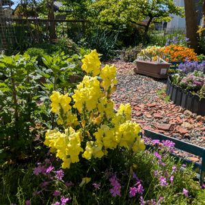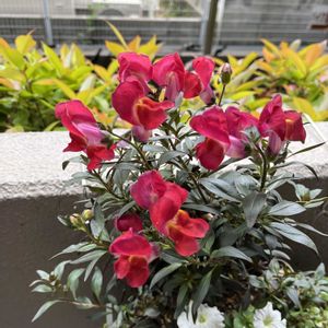 実家の兄の庭の金魚草が赤いベベ着て満開です 我が家のクリーム色の金魚草も満開で爽やか!