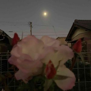 朝6時 東の空が朝焼けに染まってる 西の空には十六夜の月 寒さに負けずに花開くマチルダ 今日が始まる 吐く息が白い 素敵な週末をお過ごしください🤗💕