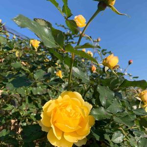 岐阜県揖斐郡大野町のバラ公園にて 母に送る富有柿を求めて出かけました。 バラ公園では、植え替えるのでしょう。 花壇の1/3くらい、抜き去られ綺麗な土が慣らしてありました。 それでもまだ、咲いているバラもあって 甘い香りが漂っていました。 これは、ゴールドバニー💛 青空に向かって綺麗でした❣️