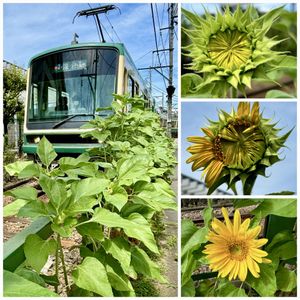 🌻もうすぐ咲くよ💛ひまわり🌻 ①毎年江ノ電の線路脇に電車をかすめるようにひまわりが咲きます💛 とっても楽しみな光景なんです😊 江ノ電、今の行き先表示板は朝顔とひまわり他です ②踏切の横にあった夏らしいグリーンも素敵でした🌿 ܸ (この子はなんてお名前でしょうか) 🏷日曜ビタミンカラー♪