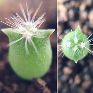 サボテンの種まきから 1か月と10日程 緑の部分は1cmまだないです トゲの生えている所が 2カ所から4カ所に😊