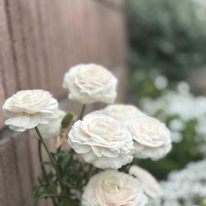 ラナンキュラス🤍 玄関前の花壇に咲いてます 🤍💗🤍 お迎えした時は真っ白だったのに… いつの間にか内側がほんのりピンク色に〜………- ̗̀(⑉˙ᗜ˙⑉) ̖́- 優しい色合いで可愛いです🤍ʾʾ