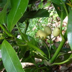 白い実のアオキ「シロミノアオキ」 高尾山で初めて発見され明治41年に命名されたというシロミノアオキ。 普通赤い実のアオキなら花は褐色を帯びた紫色です。 この写真白い実の場所からずーっと左端ギリギリの所に黒い花弁も見えますがその横に白い花、白い雌花が1輪…の半分写り込んでいます。 投稿写真ではわかりにくいかなぁ〜 ー南高尾ー