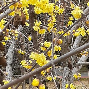 💛ロウバイ 久宝寺緑地公園 1⃣ 久しぶりの緑地 インフォメーションのスタッフさんに 「ロウバイ咲いてるよ」 って教えてもらって…♬ 綺麗な黄色💛🌿 曇り空がちょっと残念ですが☁ (ꕤ´꒳`ง)ง🤍🎵*。ٛ ෆ ̫ ෆ ٛ💛 3枚投稿です 横へスワイプお願いしますね