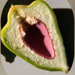 10月もありがとうございました。😊💖 🏷️「オケツの日」🍑 🏷️「トリの日」🐦 参加させて頂きます♪♪ 1️⃣初めての出合い🎶 『フィカスプミラオオイタビ』クワ科、イチヂク属。こちらは雄花序です。💚 サクっと割ると中はまっ赤❣️😱 ビックリの構造でした。 雄花なのに果実?と思い、🔍調べると、イチジクコバチ類の寄生によって花序が膨れて果実のようになるのだそうです。😅 イチジク属だけに、イチジクそっくりの甘く良い香りがしました。😃💕 植物界も生物界も不思議な事ばかりですね❣️ いつか雌株にも出合いたいと願っています。(*^ー゚) 2️⃣たわわに実る果実のような『オオイタビ』雄花序。 3️⃣あの小さな葉の『フィカスプミラ』が、このような大きなゴワゴワとした葉になってくるとは直ぐには信じられませんでした。😆 (約二年間こちらの公園が整備中だったので、途中経過の観察が出来ませんでした。( ω-、)) 4️⃣コサギの足は黄色かったのですね💛 (゚∈゚ )! 5️⃣たまに行くレストランの "季節限定スイーツ"💕 🍠紫芋のモンブランパフェ バニラアイス🍦も潜んでいます♪♪ パンナコッタになった白うさぎのオケツがプルン🎵 11月も元気に お過ごしください。🍂