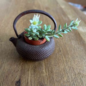 1号鉢のちいさなちいさな多肉ちゃん。のびてのびて、花が咲きました🌼 この伸びた花の部分はどうしたらいいのか… 切っていいの?そのまま?増やせる?知らないことだらけです😵💫 どなたかアドバイスいただけると嬉しいです。🫣 これまたちいさな鉄器にピッタリサイズ。でもそろそろ植え替え挑戦したい。