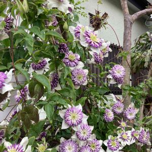 引っ越して2週間後のクレマチス紫峰。 隣り合わせにしていたら絡んでしまいました❗ まぁーいいか😅