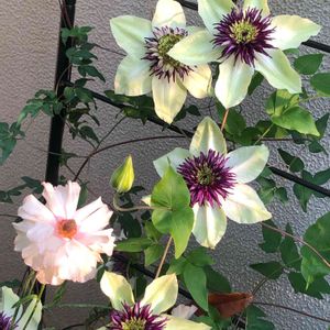 クレマチス2種類、バラ🌹とのコラボができました💚 もう1種類クレマチスの蕾があるわ😊 ここには6種類のクレマチス、 バラは3種類があって いくつコラボができるか、いつになるのか 楽しみです〜🤗