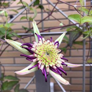 散歩の途中で見つけました。直径10センチ弱くらい?です。 クレマチスビエネッタと教えていただきました。