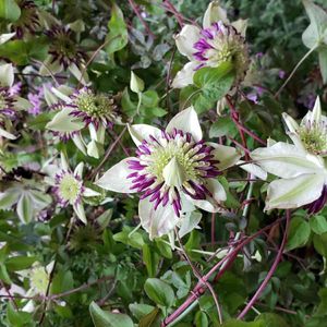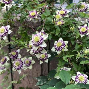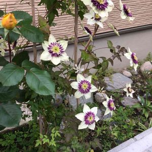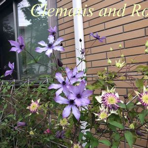 3年目の株 繰返し良く咲いてくれる、強健なクレマチス(*^_^*) 1年目は、オレンジ色の薔薇シャーロットとコラボさせたのも、まずまずだったけれど,,, 2年目の去年は紫色の薔薇レイニーブルーとコラボさせたところ、ご近所さんからの評判が、とても良かった (〃^ー^〃)🎶ので、今年も同じ配置にしてみた。 あいにくの雨模様で、引き画撮影できなかったけど😅 レイニーさんも咲き始め、いい感じになれそう🎵 【ビエネッタ 】 フロリダ系 新旧両枝咲き 弱剪定