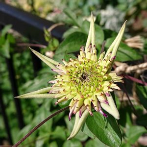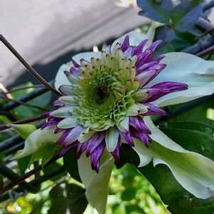 クレマチス🌿ビエネッタ とても個性的なクレマチスです😊 白万重という白い🤍クレマチスの枝変わりということで、万重咲のところがムラサキからのグリーンがのります🤍💜💚 咲き出しの尖った花びら(本当はガク)がかわいい😍 フロリダ系の特徴で、ツルに沿って両側に咲くそうです。 並んでますね。 3枚目の写真🤳クレマチスをこうして、横からとか裏側から撮るの好きです。 4枚目、白い額が落ちても真ん中のポンポンは長く残ります🌿 これだけでも景色になります🪟 5枚目、庭掃きを🧹している母が、花の名前を聞かれて困る!というので、名札をつけてみました😊