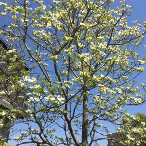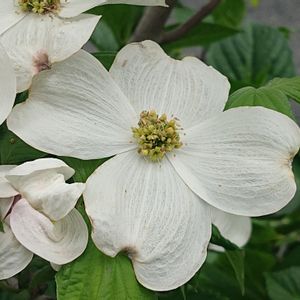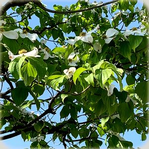 花が大きい白いハナミズキ まだ背丈の高くない木ですが,大きな花が印象的でした。連休最終日の夕方,雲行きが怪しい。