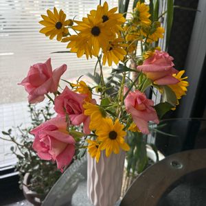 休み開けにお店に来たら💐 仕事の合間に生け生け〜🏺 結局忙しくて🫢💦 この話ゎ誰に頂いたか不明🤣💦 黄色の花📷検索したら🫢 ゴールデンピラミッド⁉️ 後バラの棘が鋭くて🤣💦 ビクビクしながら棘削ッてたに🤣💦 でも久々のお花に癒されましたとさ☺️