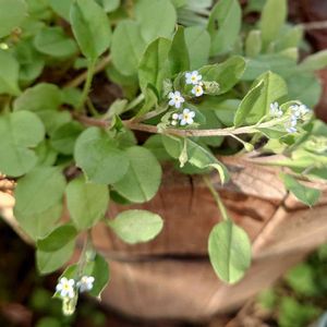 昨年から庭や植木鉢に生えだした、常緑の雑草らしき植物 スミレかな?と思い、抜かずにいました 最近になって花が咲いているのを発見! 約1mmの薄いブルーの花 忘れな草よりも小さいです 色々調べてみたけど、名前がわかりません どなたかわかったら教えて下さい😊