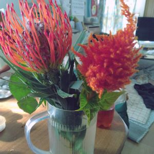 珍しいお花頂き投稿します 左は ピンクッション 右は ケイトウ ファイヤー 針刺しみたいに とげとげして刺さっているみたいな オレンジ色で面白いなあ 元気もらえそ😍😉