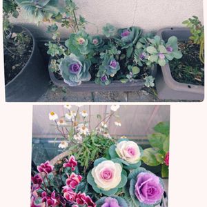 強い葉ボタン 下は去年寄せ植えで購入した葉ボタン 夏を越え菜の花みたいに伸びてましたが切り戻したり挿し木したりどんどん増えてくれました 上が増えた葉ボタン ありがとうさん😍😍😍😉✌️✌️