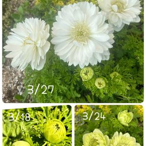 こんにちは ^ - ^ ♪ 🤍アネモネ🤍の色の変わり方です。 上: きのうは すごい風🌪️でした。 吹き飛ばされそうになりながら 真っ白ふわふわに開いてくれていました。 下左: 蕾の時は🍋🟩ライムグリーン色でした。 下右: 開き始めは🍋🟩ライムグリーンがうすくなってきました。 きょうは☔️にぬれながらも ふわふわの可愛い姿です。
