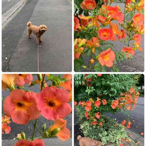 今朝の🐩🐾お散歩(*´ω`*) いまあちこちで見掛けるノウゼンカズラです❁⃘*.゚ 午後から大雨で明日、明後日も大雨;(´•௰•`)☂ やだわ、どうしましょう(._."Ⅱ)