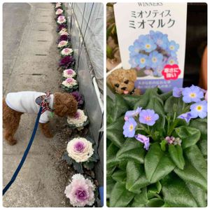 🐩❤︎雨が降る前に早目のお散歩🐔<コケコッコ- 左、花農家さんのビニールハウス前。 右、HCで一目惚れしたワスレナグサより 大き目サイズのお花( ॣ•͈૦•͈ ॣ) いっぱい増えてくれると良いな♡❁⃘*.゚