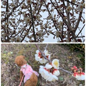梅とめるちゃん♪ お散歩コースにある農家さんの梅林。 今日は夕方から//☂//ザーザー降りって 言ってたよ;(´•௰•`)☂ 花が散らないといいけど…(。•́︿•̀。)