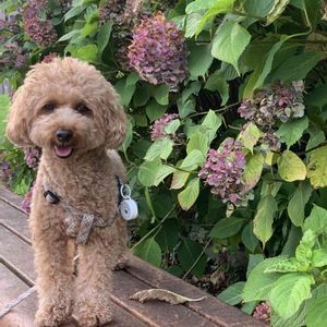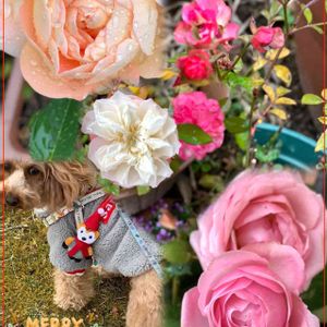 夕散歩の園芸店跡地で薔薇を撮って 来ました🐩🐾 ピカピカ光る首輪をしています✨