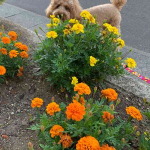今日のお花❁⃘*.゚ 朝ん歩の途中、近所にあるスーパーの 花壇でマリーゴールド発見🌼👀 蕾が2個… 上手い具合いに…笑笑 めるちゃんの鼻の穴に(Ŏ艸Ŏ) (…入ってるわけでは無いです笑笑)