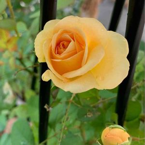 黄色い薔薇が開いて来たよ(*^^*) …でも葉っぱが!! ᗦ↞◃ホネホネになってるぅ(。・´д`・。)