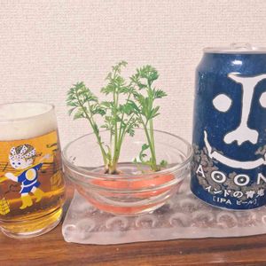 人参の葉っぱ🥕成長が遅くなりました🤔 教えて頂いた「インドの青鬼」さんを発見したので、美味しく頂きました! マスカットの様な香り…😋 そして苦味が大変なことになっていると伺ったので、ドーナツをアテに2人で一本空けました♪ 飲みごたえあって美味しいです😆🍺 缶も可愛い💕