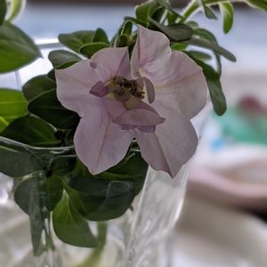 鉢植えでモリモリになる日を妄想しながら月日は流れ 厳しい現実に呼び戻されて✄✄ 台所のガラス瓶のなかで可愛く咲いてくれています。 水栽培しようかしら💙💙
