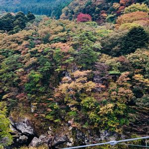 10月31日、鬼怒川温泉の鬼怒楯岩大吊橋にて、眼下に広がる鬼怒川の清流と、色付き始めた樹々❗️ 義父と妻と3人で、奥鬼怒の紅葉🍁🍂を 観に。