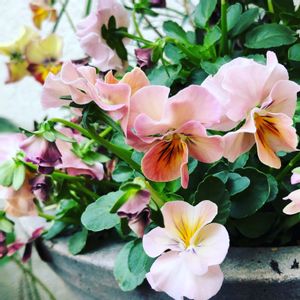 ウエタオリジナルビオラ キャンディウェーブ フリフリでアンティークピンクな感じがとっても可愛い子です〜💗💗 この子たちは一緒にカゴ風の器に寄せ植えしましたよ✨✨