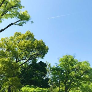 鶴舞公園💚 昼散歩♫から 爽やかな五月晴れに飛行機雲✨ 木々の若葉が目の保養😊 明日から天気は下り坂のようです。 風で飛ばされないように ベランダの植物を移動させました。
