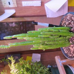 1年ぶりくらいの登場です。 電磁波サボテンで有名なセレウスですね。 もともと、もっと型が良かったのですが、 頂点を枯らしてしまい、一部、型が崩れてしまいました。 それでも、全然悪くないですよね。