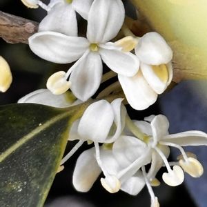 晩秋に咲く、白く小さな花で (直径5mmほど) 葉陰に埋もれるように咲く🎶 花びらは4裂し 反り返る。 🐽キンモクセイに似た香り🐽 柊(ひいらぎ)モクセイ科
