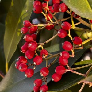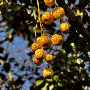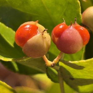 花後にできる果実は球形 直径7~8mmほど 熟すと果皮が3~4つに裂けて 仮種皮に包まれた種子が 顔を出します❣️ 柾(まさき)の果実 ニシキギ科