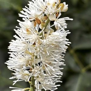 白い小花が多数集まった ブラシ状の穂状花序をつけます。 花には両性花と雄花がある 花弁やガク片は開花すると すぐに脱落し 乳白色をした 雄蕊の花糸や葯が残る (春にJA産直で苗🌱を購入) 晒菜升麻(さらしなしょうま) キンポウゲ科